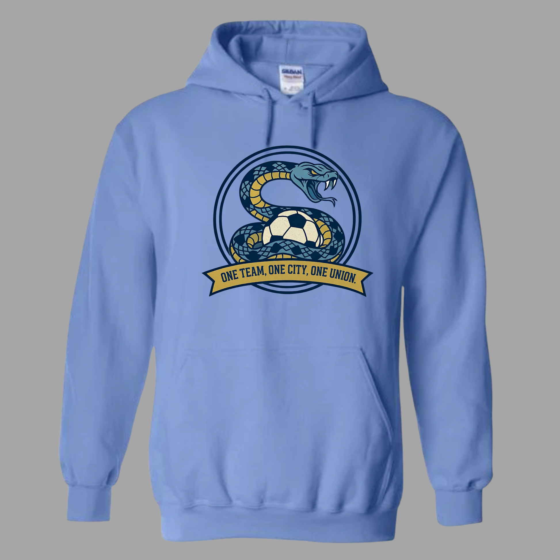 Rep your squad with bite! This light blue hoodie features a fierce snake coiled around the ball, locked in a circular crest that screams Philly toughness. The yellow banner below says it all: One Team, One City, One Union.